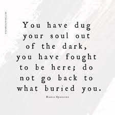 If I’m tempted in any area of my former bad habits, I read two things: my Best Sane Higher Self proclamation and this fabulous quote: “You have dug your soul out of the dark, you have fought to be here, do not go back to what buried you.”